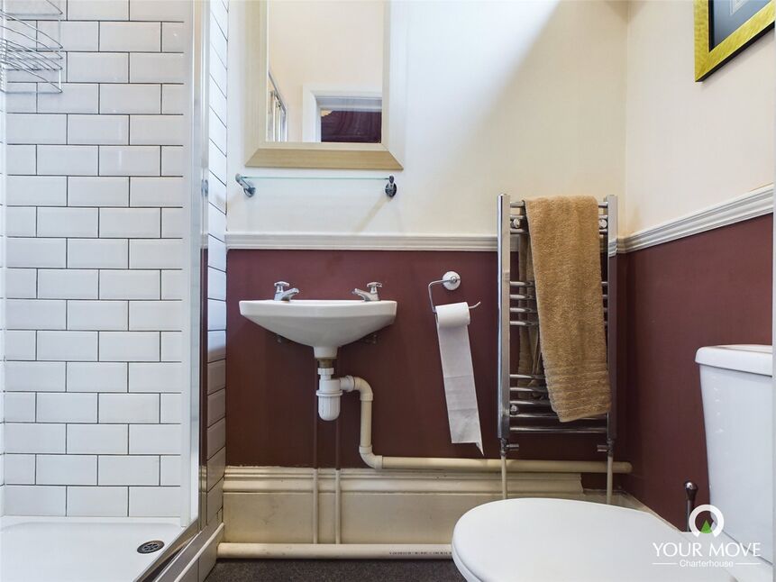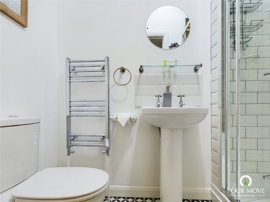 Double glazed obscured window to the rear, ceiling height featured arched window to the hall, metro tiled shower cubicle with rainfall shower plus further shower head, wall mounted wash basin with glass shelf and mirror over, close coupled WC, dado rail, heated chrome towel rail.