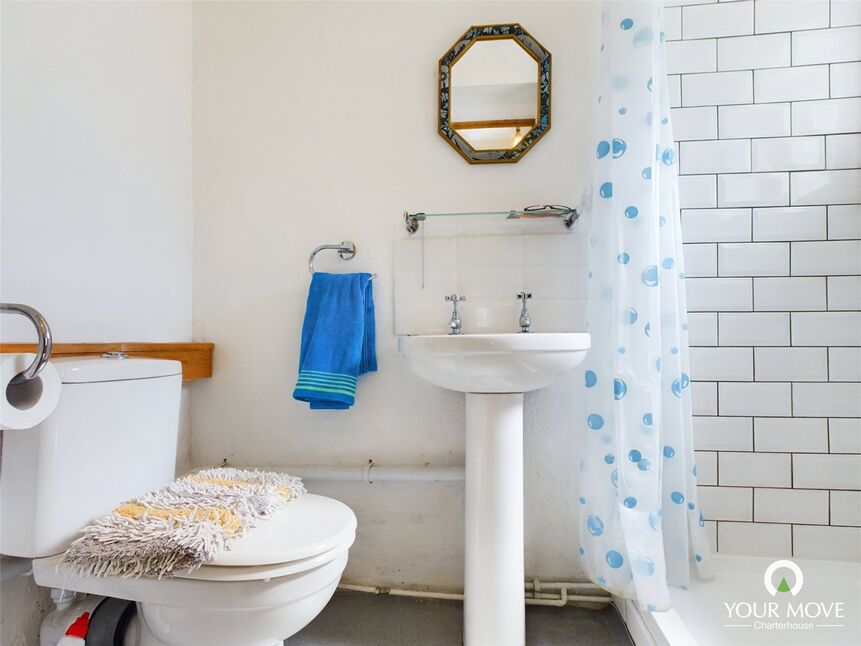 Double glazed obscured window to the rear, metro tiled shower cubicle with rainfall shower plus further shower head, pedestal wash basin with metro tiled splashback, glass shelf and mirror over, close coupled WC, dado rail, heated chrome towel rail.