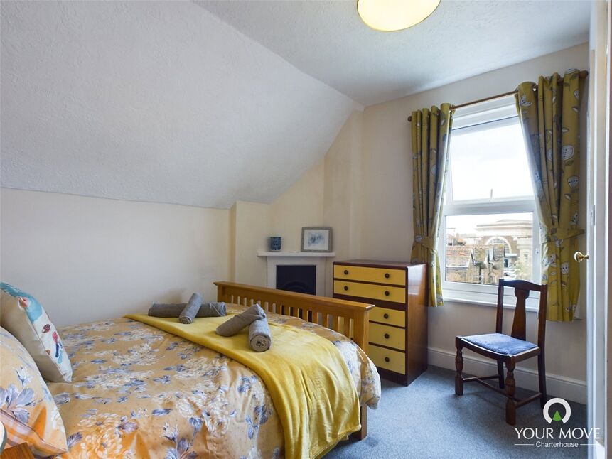 Currently setup as a lounge area, double glazed window to the side, cast iron fireplace, carpeted, TV point, radiator, storage into eaves.
