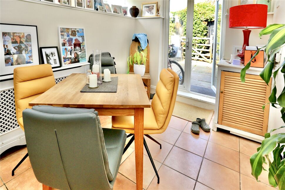 Leading off the living room, this conservatory style room has side facing windows, rear facing French doors and an opening into the kitchen.