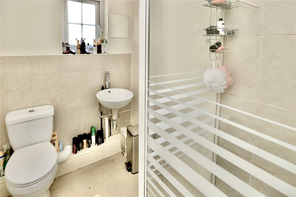 Leading off the second bedroom and fitted with a corner shower cubicle. wash basin, low flush wc and rear facing window.