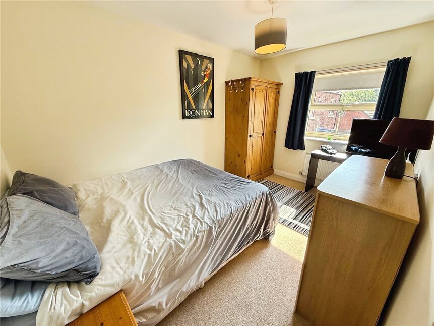 Generously sized third bedroom hosting carpet flooring, radiator, fitted cupboard and a double glazed window to the front aspect.
