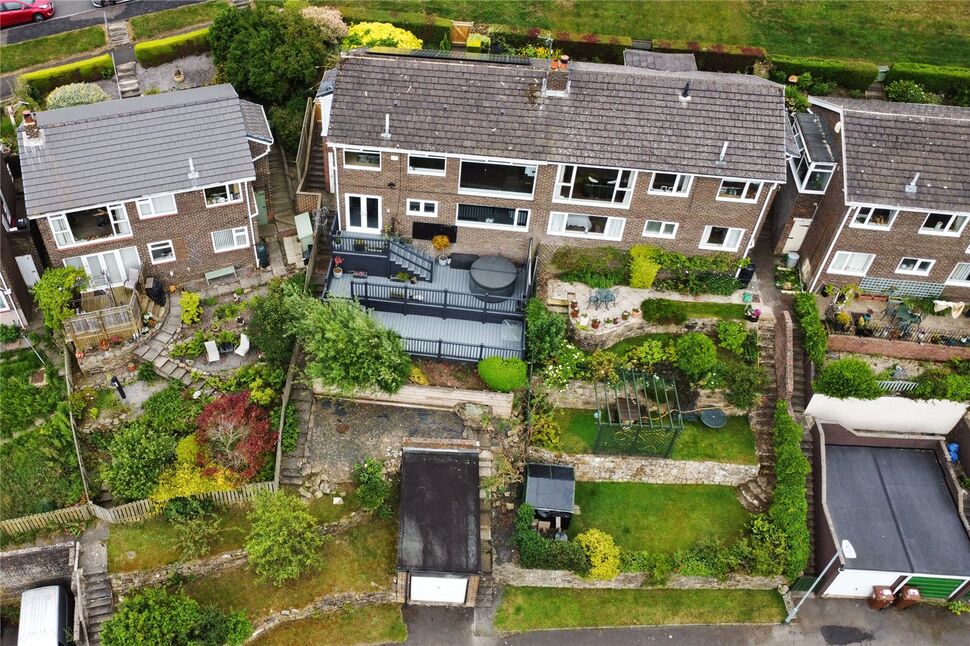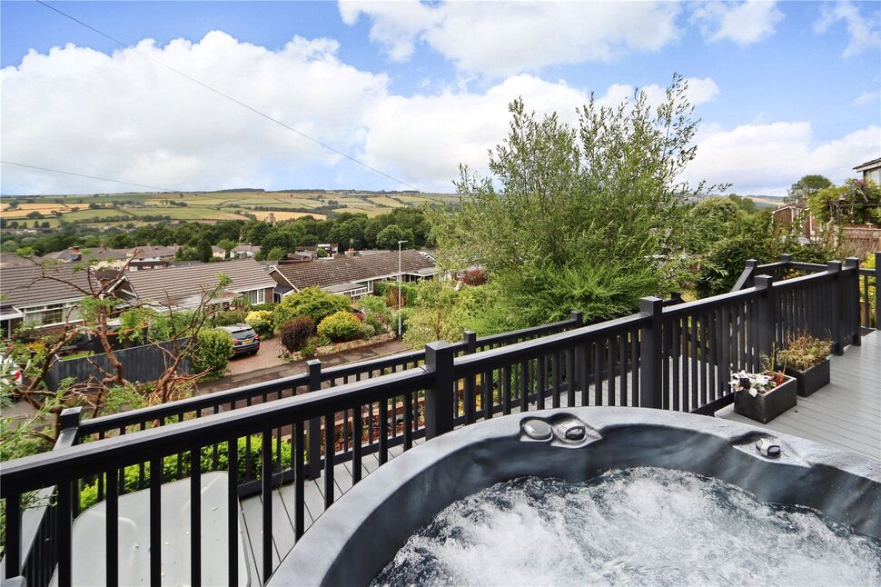 Externally, the tiered composite decking is a real feature and has made excellent use of the natural contours of the sloping site as well as maximising the views, particularly with the ideal positioning of the hot tub on the first level down from the French doors. Below the decking and the steps are raised planted borders with a sloping lawned garden continuing down to the road behind, where there is a garage. To the front there is a small artificially-turfed garden, a block-paved patio and chipped slate beds, with a wooden gate for access from the path. There is also a recessed wooden bin store easily accessed from the pavement.