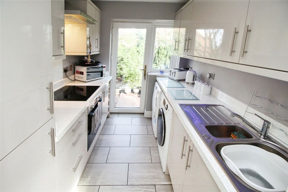 Double glazed door and double glazed window to rear, modern refitted range of wall and base units, worktops incorprating one and a half bowl sink and drainer unit with mixer tap above, electric hob with oven beneath and extractor hood above, integrated fridge freezer, plumbing for washing machine and space for other domestic appliances.