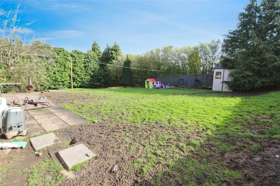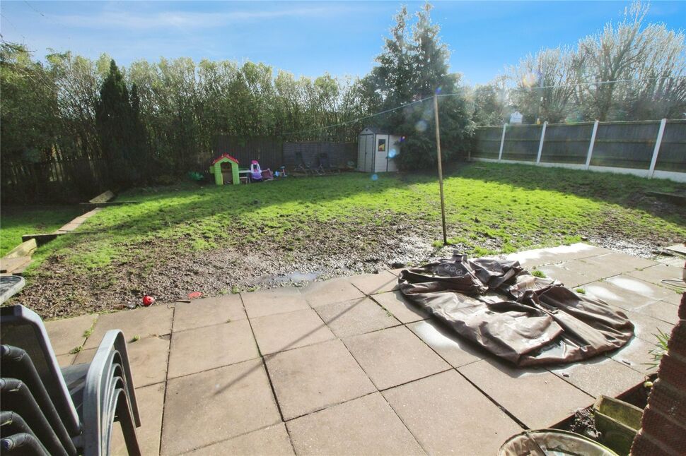 A rear garden, mainly laid to lawn, bondary fencing enclosing, gateway entry.