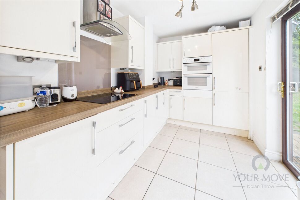 To the rear, the extended kitchen/diner is a true highlight. Fitted with a stylish range of modern base and eye-level units and generous worktop space, it’s perfect for both everyday life and entertaining. A built-in breakfast bar offers a casual spot for morning coffee, while there’s more than enough room for a large dining table for family meals or dinner parties. Glazed doors open out to the garden, filling the space with natural light and creating a seamless connection to the outdoors.
