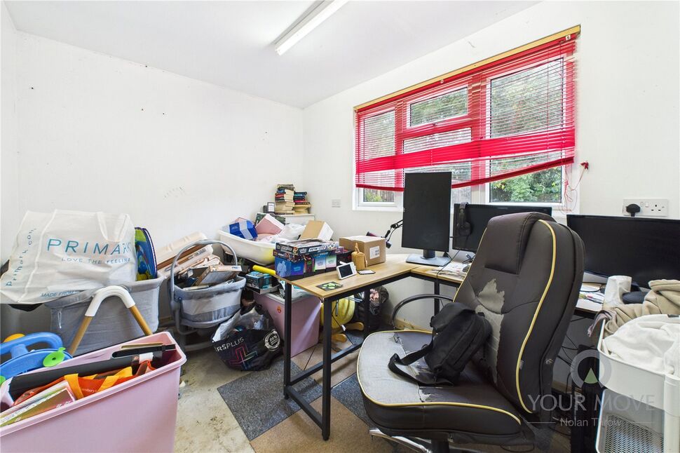 To the side, you’ll find a larger-than-average detached garage, which includes a useful office or hobby space at the rear—an ideal solution for those working from home or in need of extra storage. A private driveway offers ample off-road parking.