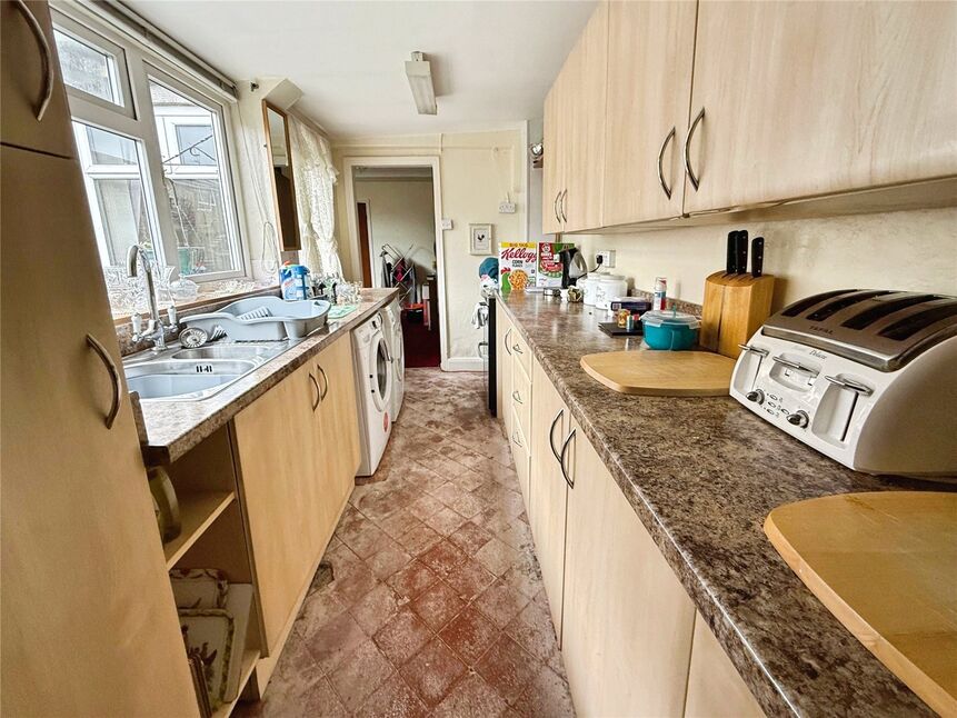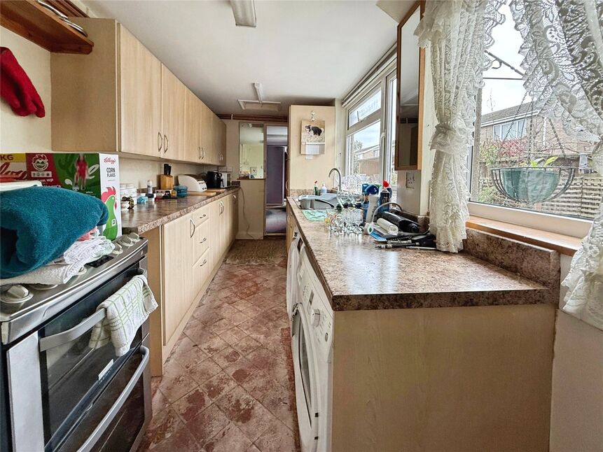 Having fitted work surfaces, space and plumbing for appliances, one and a half bowl stainless steel sink unit with drainer and mixer tap over, two double glazed windows to side aspect, wall mounted gas combination boiler, loft access.
