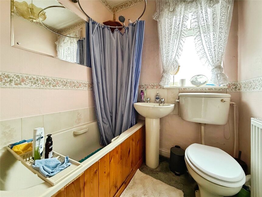 Three piece suite comprising of panelled bath with shower fitted over, low level WC, pedestal wash hand basin, double glazed frosted window to rear aspect, airing cupboard, radiator.