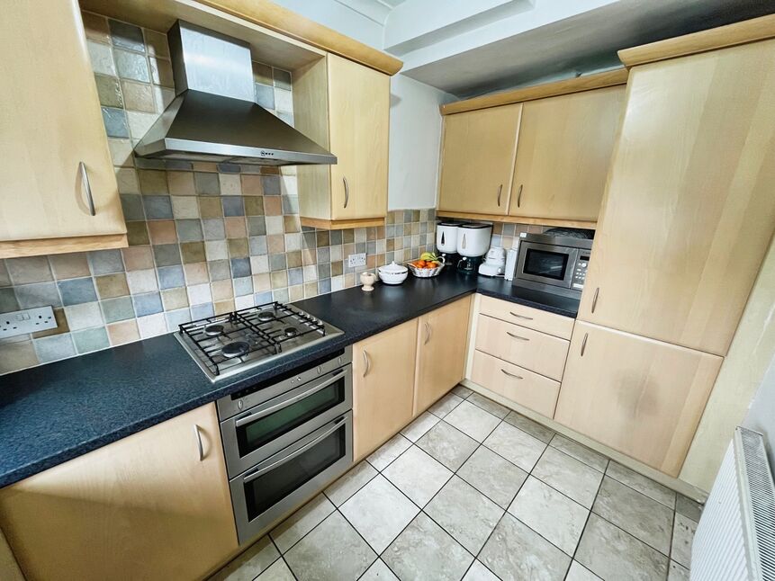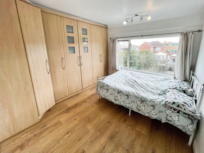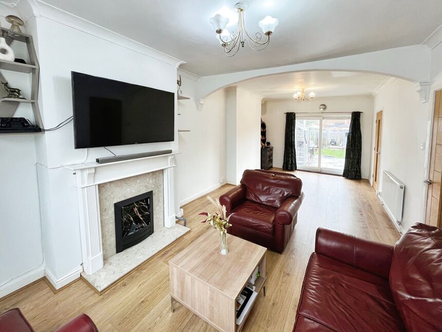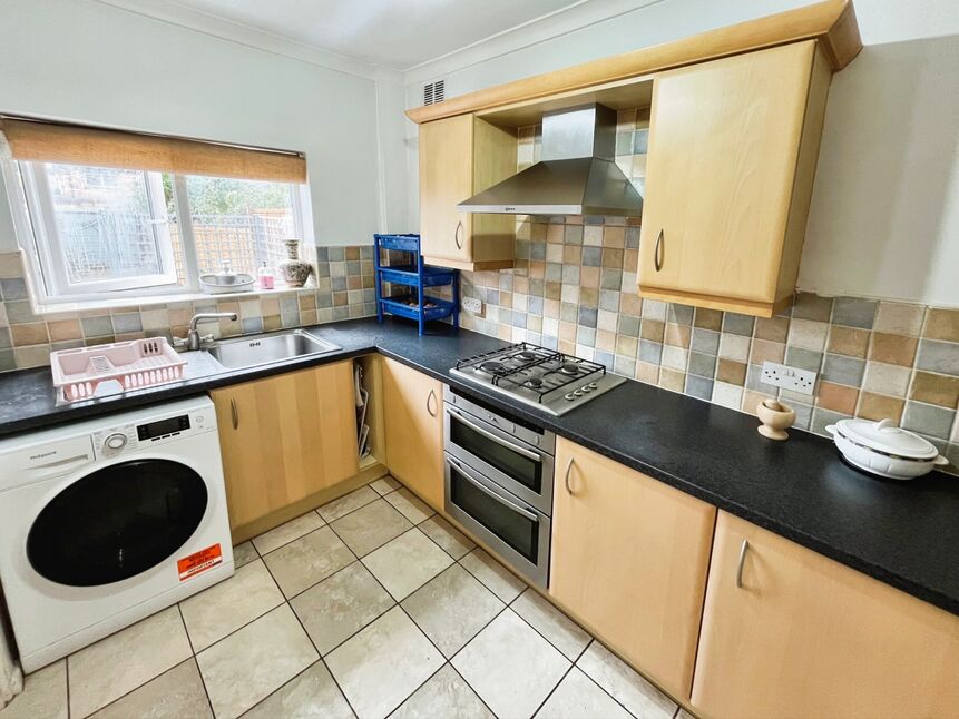 The property features a spacious lounge/diner with large windows and patio doors, providing access to the fabulous rear garden. This reception room, along with the rest of the house, benefits from an abundance of natural light. The kitchen is well-equipped with wall and base units, a gas hob electric oven, integrated fridge/freezer, and has plumbing for a washing machine installed.