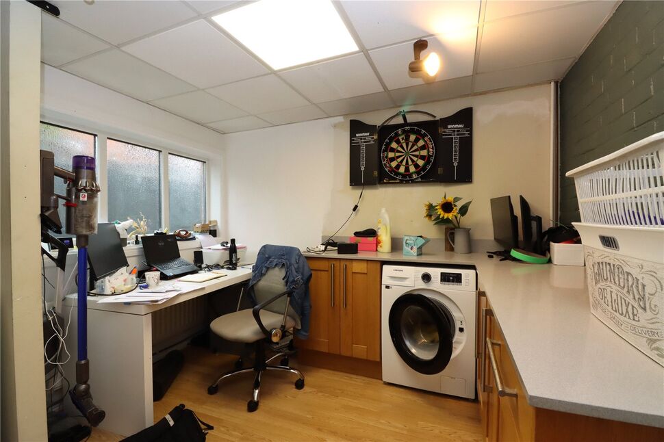 The open-plan kitchen/diner is the heart of the home, complete with integrated appliances, a central island, and French doors opening out to the rear garden ideal for both everyday living and entertaining. A separate utility room provides additional storage and practicality.