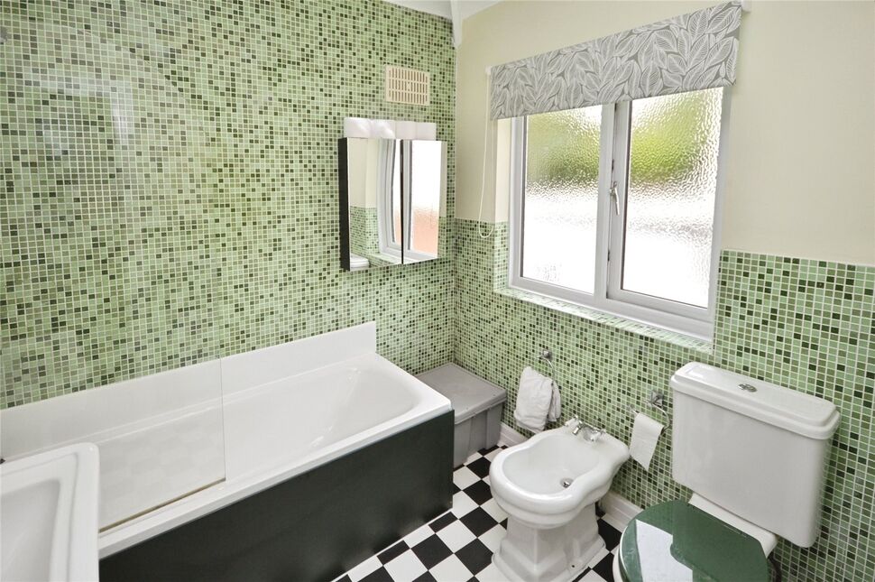 With obscured double-glazed window to side, twin-door mirror fronted cabinet, large pedestal wash-basin, close-coupled W.C, bidet, panelled bath with tempered-glass shower screen, mains shower attachment and further electric shower over, part-tiled walls, and chequerboard vinyl flooring.