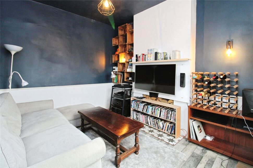 A separate, cosy living room with navy painted walls and laminated flooring.