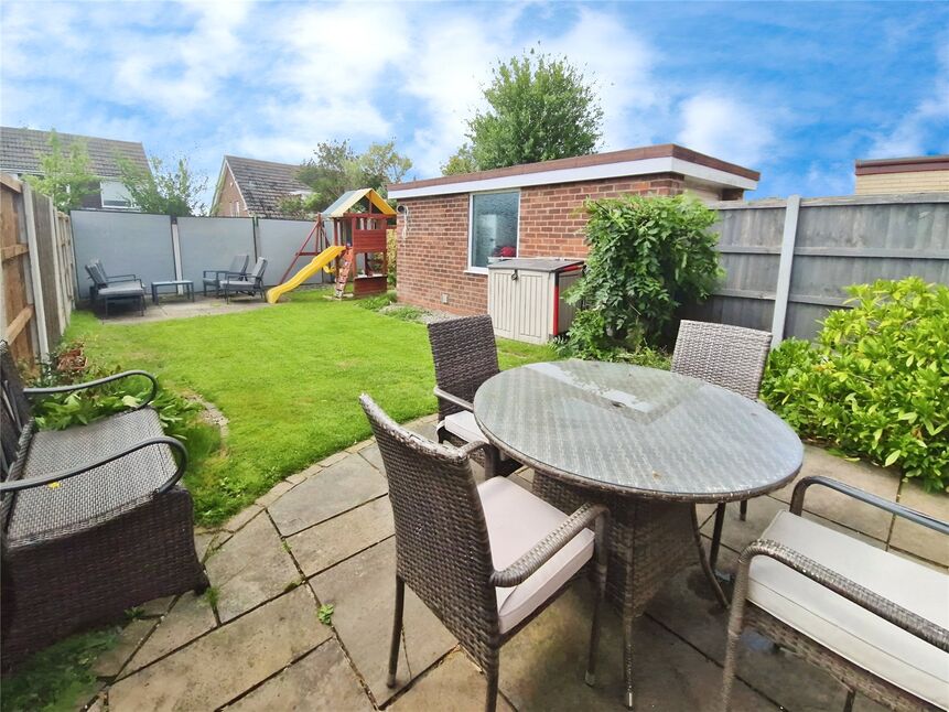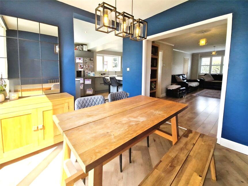 Externally, there is a front garden with driveway to the side for multiple vehicles, leading to the detached garage at the rear. There is a fantastic size rear garden with lawn and patio seating areas to both the front and back of the garden.