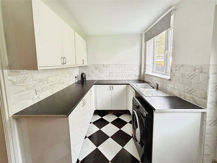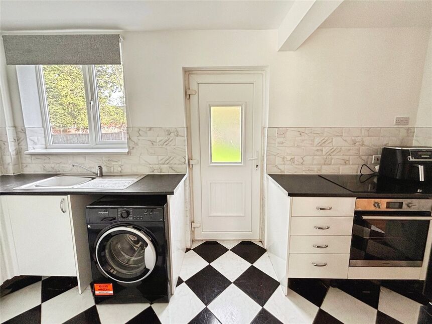 A modern kitchen, having a range of wall and base level units, providing cupboard and drawer space, roll top work surfaces incorporating a sink drainer with mixer tap and tiled splashbacks. A built in electric hob and oven. Plumbing and space for a washing machine and fridge freezer. A central heating radiator, tiled flooring, storage cupboard understairs and a double glazed window and door leading out onto the rear garden.