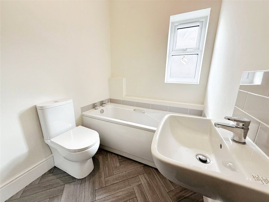 Fitted with a four piece suite including a walk in plumbed shower, pedestal wash hand basin, closed coupled WC . Bath with tiled splash backs and double glazed window to side elevation.