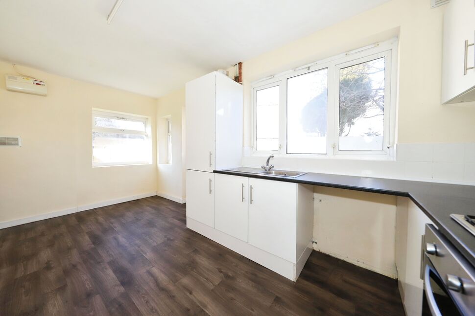 With two double-glazed windows to rear, two double-glazed windows to side, door to rear garden, and being fitted with a range of matching wall and base units with complementary work-surfaces and tiled splash backs, gas hob and built in oven ( both in need of installation), plumbing for a washing machine, and inset sink-drainer unit with mixer tap over, dining area, and the whole having wood-effect flooring.
