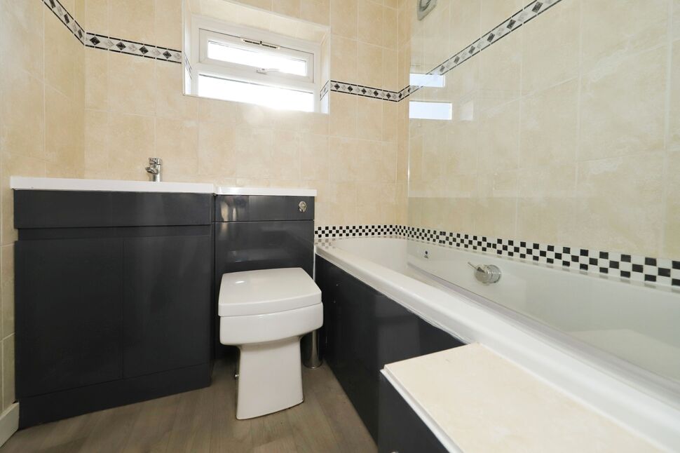 With obscure double-glazed window to front and refitted with a modern three-piece bathroom suite with p-shaped panelled bath with shower above and glass shower screen, and sink and WC set into storage unit, extractor fan, and the whole having feature tiling to the walls and wood-effect flooring.