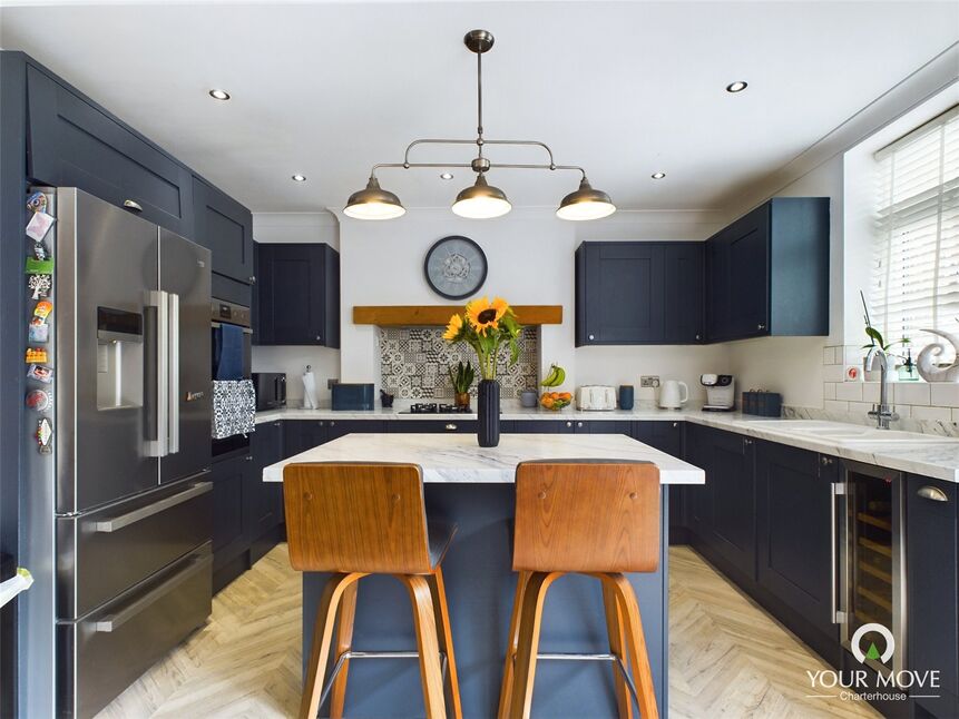 Open plan with a double glazed window to the rear with fitted blind plus double glazed French doors opening to the rear garden. The fitted kitchen has a range of matching wall and base units in an anthracite grey plus an island which is home to the integrated dish washer and breakfast bar with pendant lights over. Marble effect worktops with upstands, metro tiled splash back with a 1.5 bowl ceramic sink. Eye level electric double oven, 5 ringed gas hob with extractor over, American style fridge freezer, integrated washing machine, integrated bottle chiller. Laminate flooring, downlights, modern white vertical radiator, coving, TV point, cast iron radiator, built in cupboard space for table and chairs and a feature fireplace.