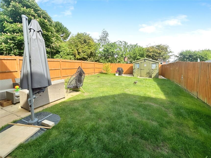 An enclosed garden laid to lawn with patio area and space for shed. Secure gated access to front.