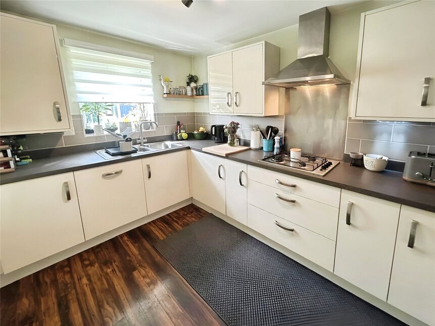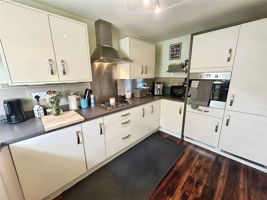A modern, fully fitted kitchen with a range of wall and base units with stainless steel sink unit with mixer tap, fitted gas hob with extractor over and electric oven beneath. Fitted appliances to include full sized dishwasher, washing machine and tall fridge and freezer