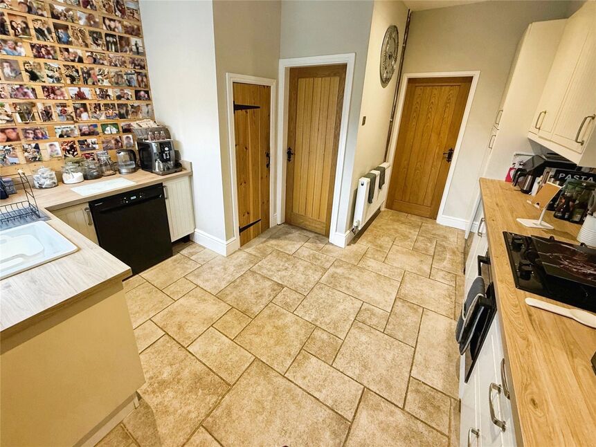 Fitted kitchen comprising a range of wall and base units with contrasting work surfaces, free standing dishwasher, sink and drainer unit, ceiling spotlights, radiator, integral oven with a four ring gas hob and extractor hood, timber panel feature wall, hard wood door to the pantry and a double glazed window to the rear aspect.