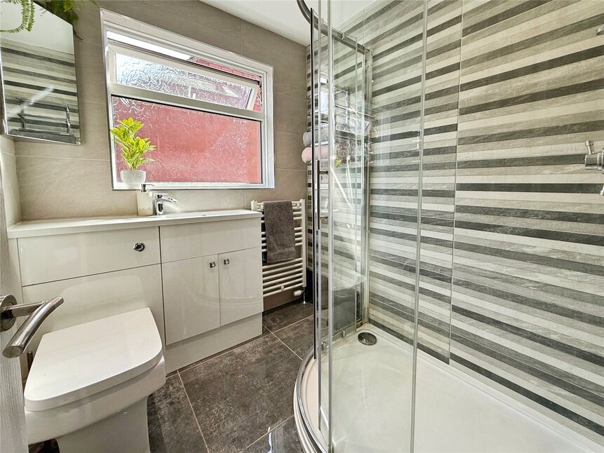 Modern shower room comprising a corner shower unit, low level WC, vanity unit wash hand basin, tiled flooring, fully tiled walls, extractor fan and a double glazed window to the side aspect.