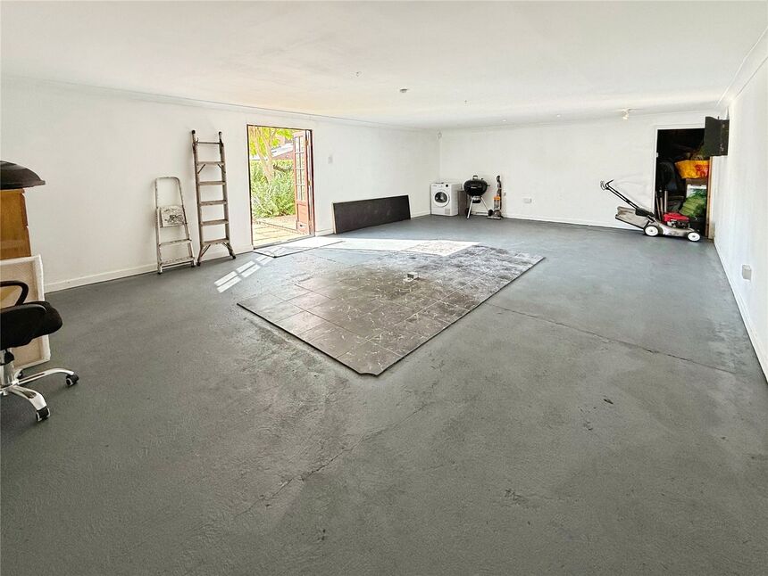 Expansive and exceptionally versatile garden/games room located at the bottom of the property. This blank canvas space has been fully re-skimmed and painted, hosts internal power and lighting and double doors to the garden and lends itself to multiple uses.
