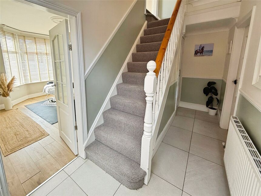 Inviting and homely entrance hall comprising an understairs storage cupboard, composite entrance door to the side aspect, radiator, laminate flooring and ascending carpet staircase to the first floor landing.