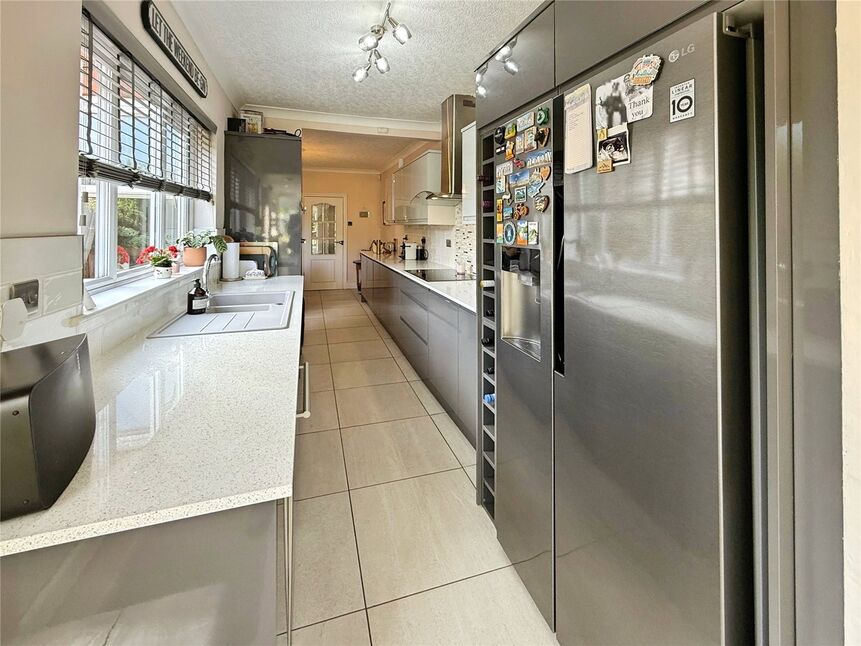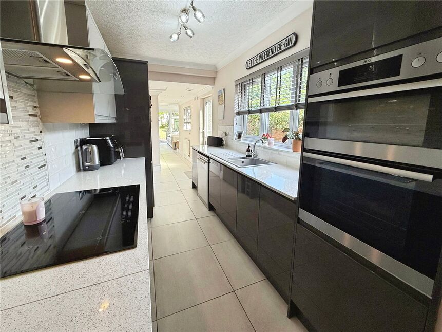 Modern and impeccably presented two tone kitchen comprising a range of soft close wall and base units with contrasting work surfaces, integrated double oven, integrated dishwasher, space for an large American style fridge-freezer, integral induction hob with an overhead extractor hood, sink and drainer unit, USB charger sockets, tiled flooring, double glazed window to the side aspect, uPVC door to the side aspect and a bright and airy flow through to the rear sun lounge.