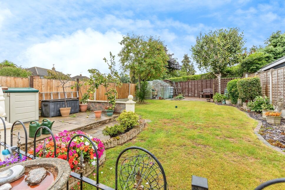 The spacious lounge/dining room is the heart of the home, featuring a charming fireplace as its centrepiece. From here, double doors open into a bright conservatory, which in turn leads straight out onto the well-maintained, south-facing garden — creating a natural flow between the indoor and outdoor spaces and making it ideal for family life or entertaining.
