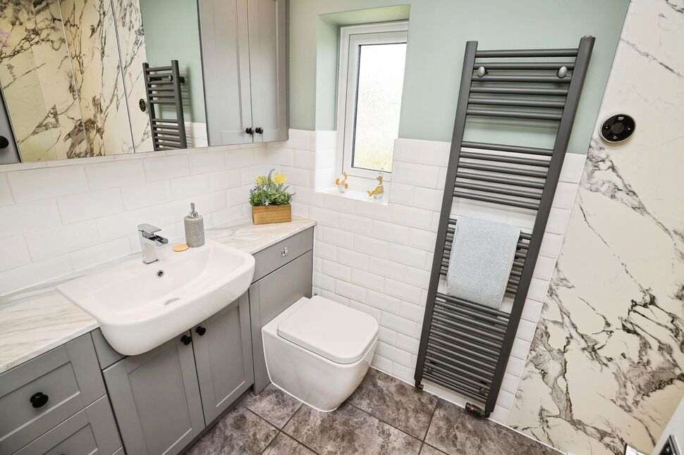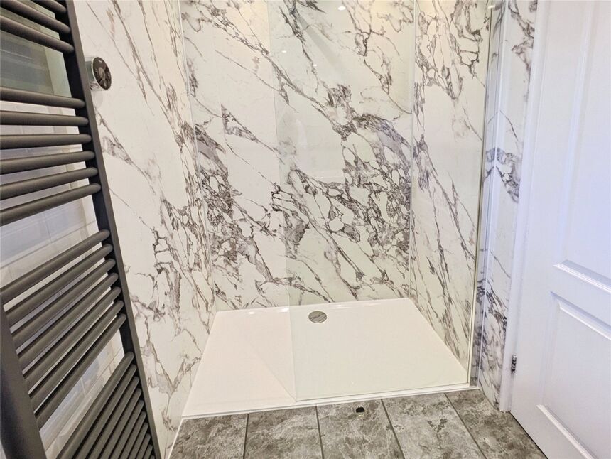 Refitted & re-tiled suite, comprising WC, wash basin, double shower cubicle with Mira digital shower, tiled floor, under floor heating, towel radiator, double glazed window.