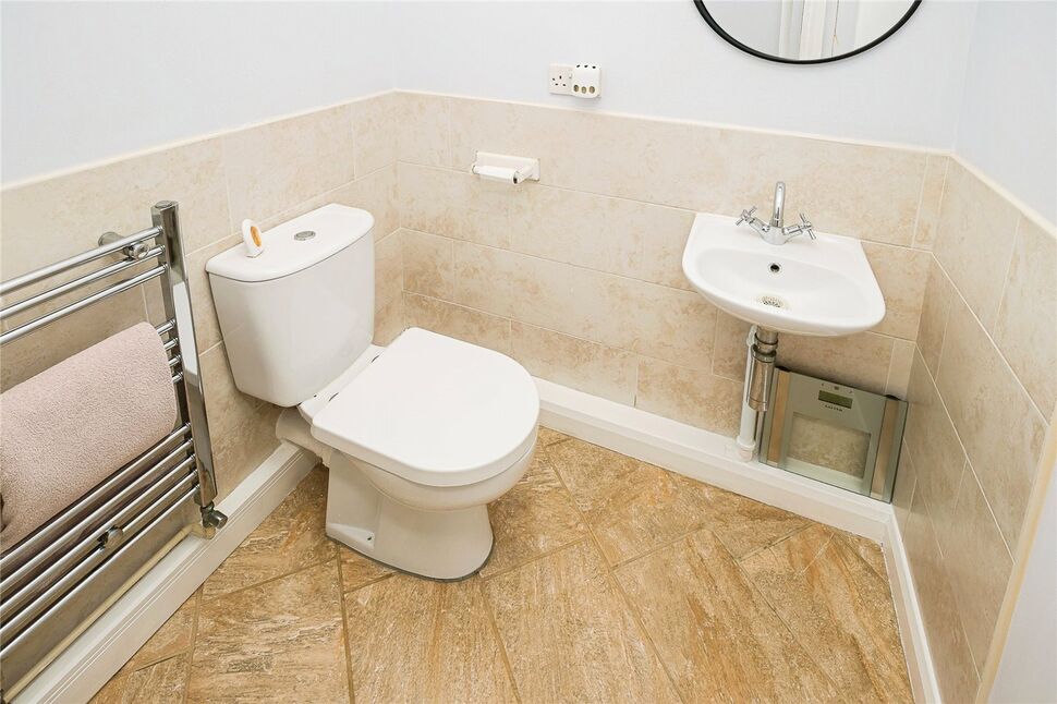 Comprising WC, wash basin, towel radiator, tiled floor.
