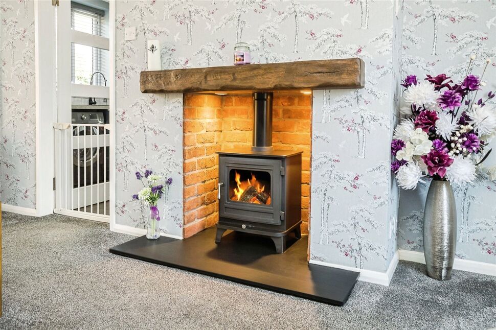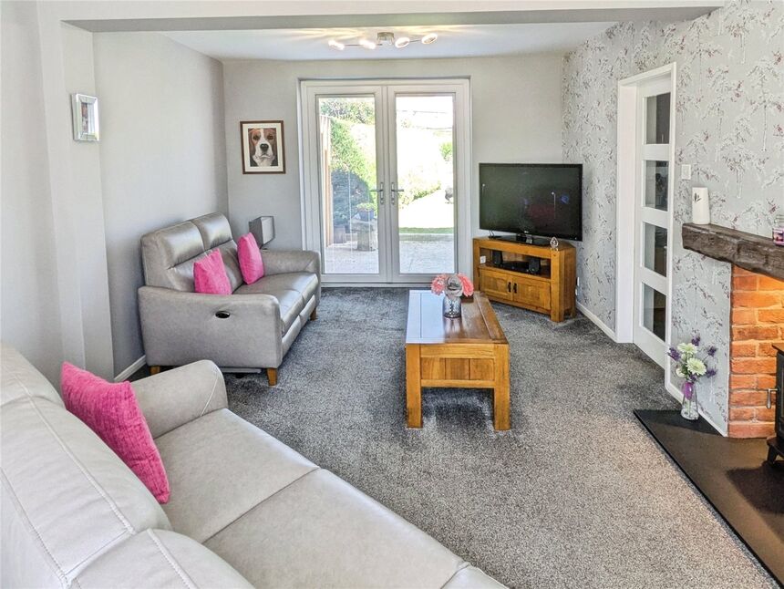 With a feature fireplace and log burner with concealed down lighting, slate hearth, radiator, double glazed window, double glazed French doors with internal blinds leading into the rear garden.