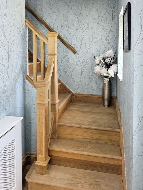 Oak dog leg staircase, radiator, decorative double glazed door.