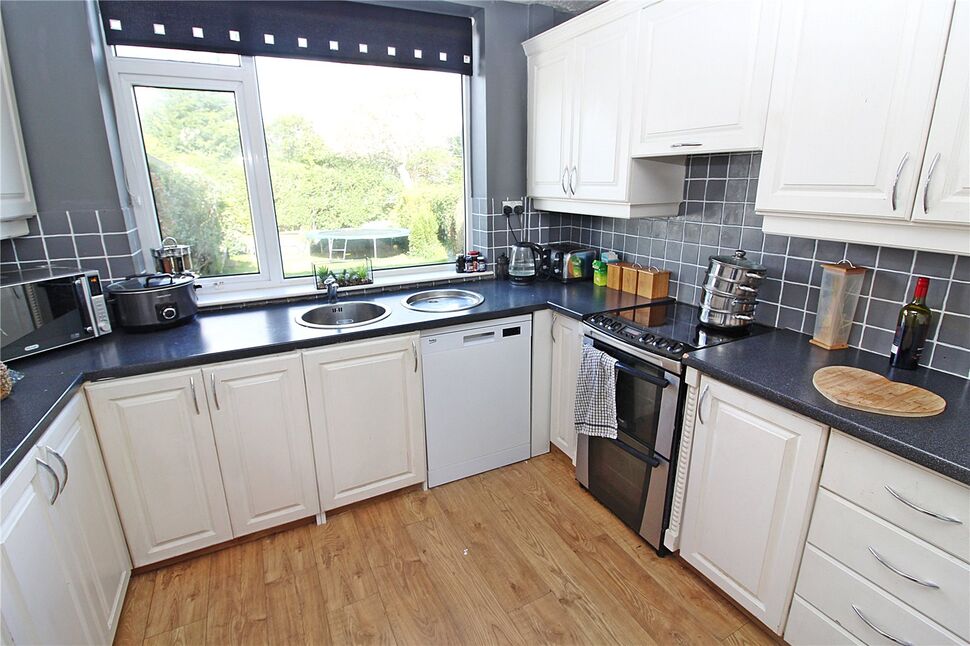 Fitted with a range of base units, cupboards and drawers, inset sink unit, dishwasher plumbing, double glazed window to the rear, side entrance door.