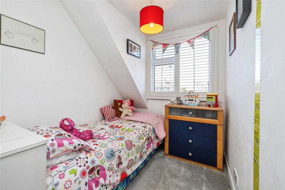 Generously sized third bedroom hosting carpet flooring, built in over stairs shelving and cupboard, radiator and a double glazed window to the front aspect with fitted timber shutters.