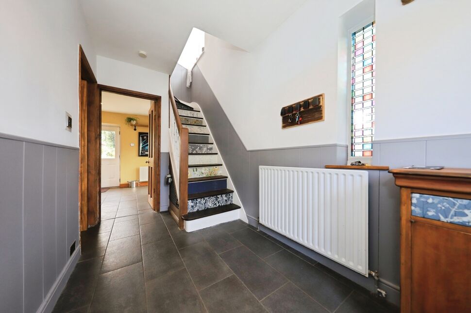 Double glazed entrance door, radiator. side double glazed window, tiled flooring, stairs to first floor.