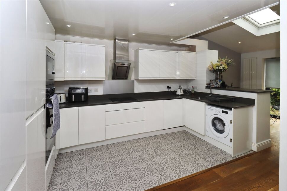 Fitted white modern high gloss wall and base units with granite work surfaces, built in double electric oven and microwave, electric hob with extractor above, integrated one and a half bowl sink and drainer, integrated fridge freezer, dish washer and washing machine, breakfast bar, tiled flooring to kitchen area, two double glazed Velux windows to family area, double glazed Bi-fold doors to the rear, three panelled radiators, wood flooring to family area and dining area and Oak wood and glass railed stair case to first floor.