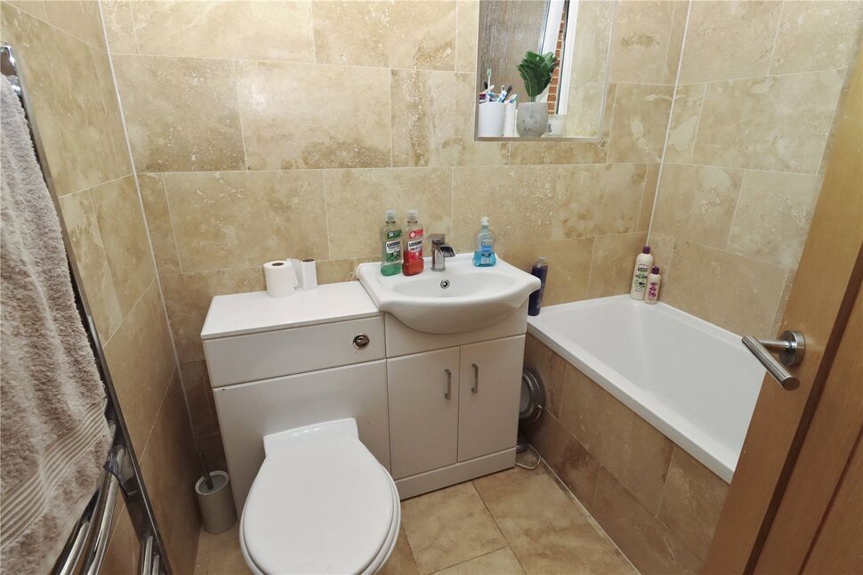 Tiled panel bath with mixer shower taps, vanity wash hand basin, enclosed cistern WC, double glazed frosted window to the side, tiled walls, tiled flooring and heated towel rail.