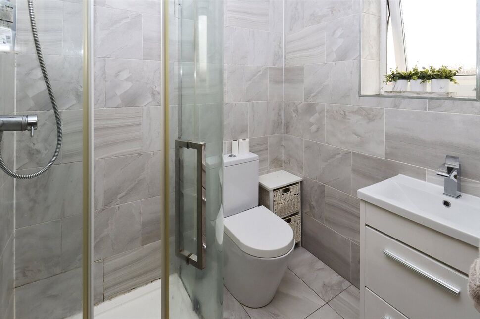 Three piece suite comprising of: Corner shower cubicle with plumbed shower, low level WC, vanity wash hand basin, double glazed frosted window to the rear, tiled walls, tiled flooring and heated towel rail.