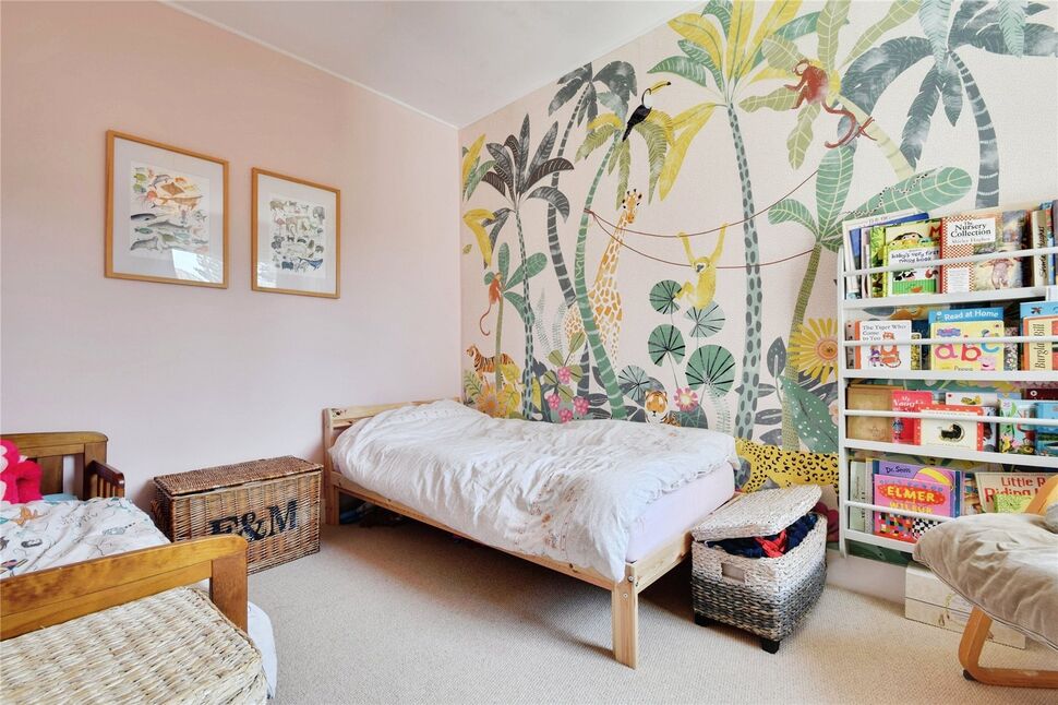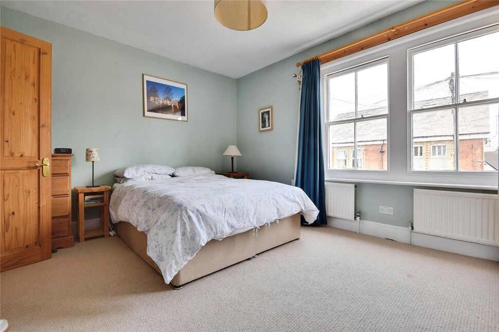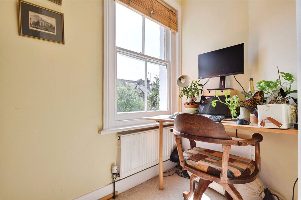 Upstairs, the first floor offers two double bedrooms and a modern family bath/shower room. The master bedroom to the front is especially spacious, featuring sash windows and an original fireplace. A second double bedroom overlooks the garden, and a separate study provides flexibility for home working. The family bath/shower room is finished to a high standard with a freestanding bath, walk-in shower, WC, basin, and chrome heated towel rail. On the top floor, the third bedroom is a generous double with ample space for furniture and useful eaves storage — ideal as a guest suite, teen room, or additional workspace.