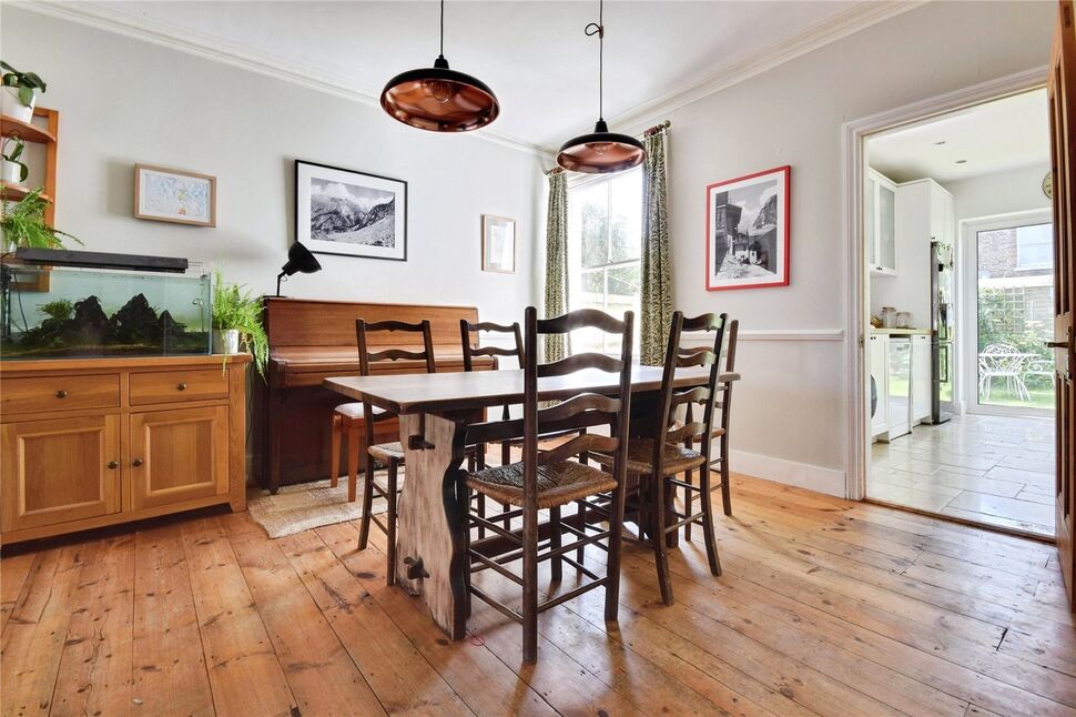 An arched entrance set behind a pretty front garden leads into a generous hallway, setting the tone for the home’s elegant and welcoming feel. The main living area has been thoughtfully opened up to create a spacious living/dining room, ideal for family life and entertaining, with a large bay window, original fireplace, and exposed wooden floorboards adding warmth and character and combines a spacious living room and dining area. To the rear, the kitchen is well-appointed and has been subject to much change with a range of sleek white cabinetry, wooden worktops and breakfast bar and integrated appliances including a fan oven, gas hob, and extractor. There is further space for white goods and direct access to the rear garden from large French style double glazed doors