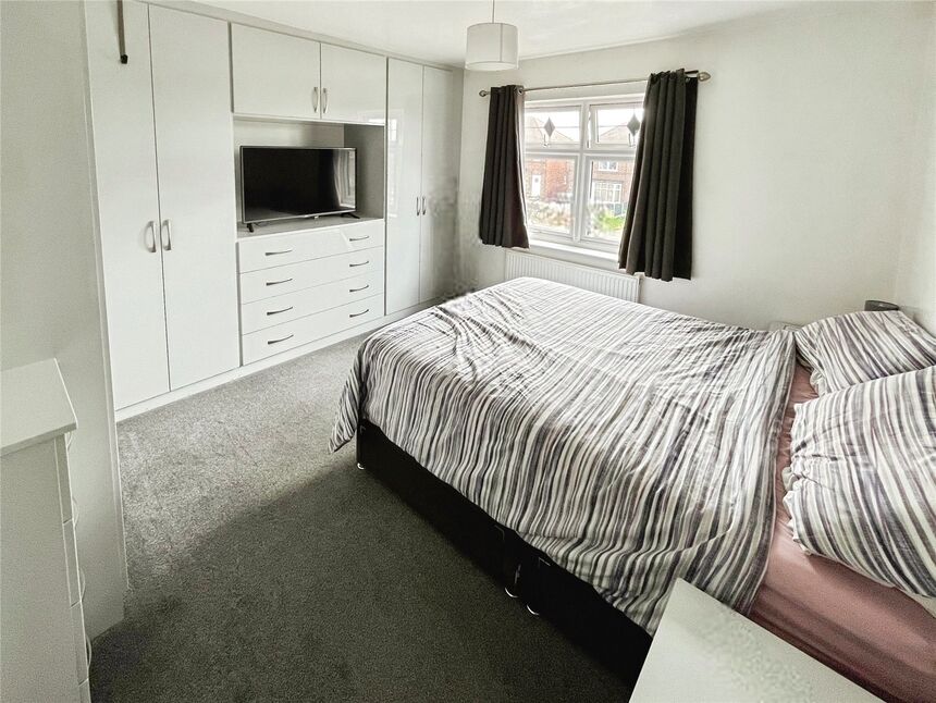Fitted with matching high gloss triple wardrobes with matching draws and bedside storage. Matching built in over stairs storage cupboard. Double glazed window to front elevation.