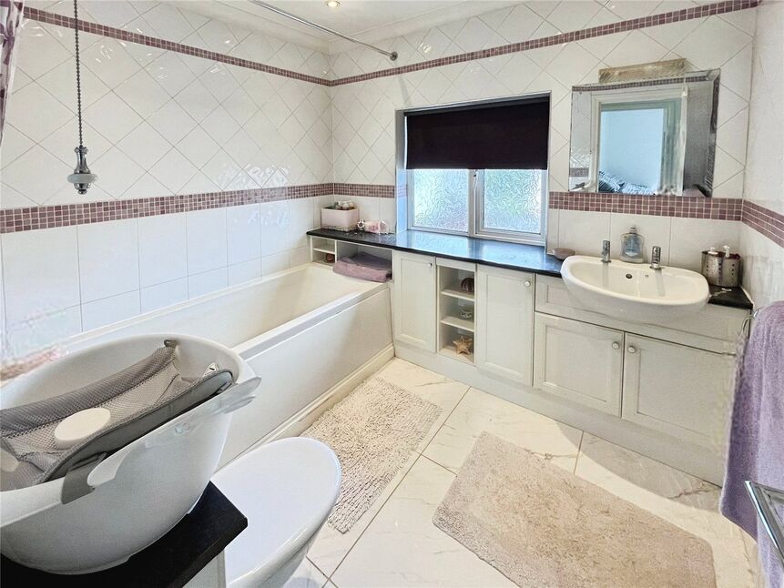 Fitted with a two piece suite comprising close coupled WC. Vanity fitted storage incorporating wash hand basin and double glazed window to rear elevation.