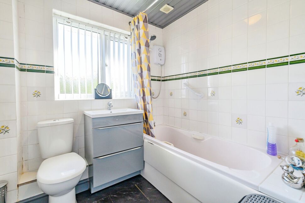 Comprising of a three piece white suite, panelled bath with shower over, hand wash basin and vanity unit, low level flush wc, , radiator, uPxvc double glazed frosted window to the rear elevation, tiled elevations.