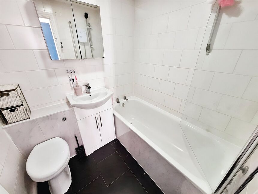With Bath , Low Level Wc , Wash Hand Basin with Vanity Unit beneath and Fully Tiled.