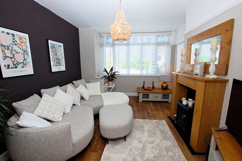 PVCu double glazed window to front, feature fireplace, picture rail, wood effect flooring, vertical radiator and double doors to the dining room.