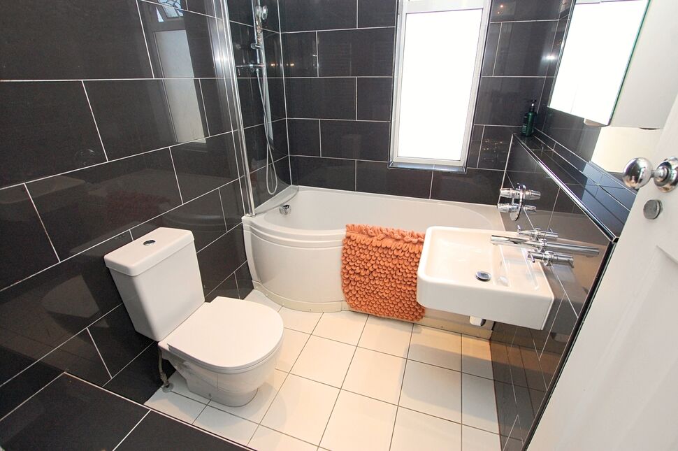The bathroom is fitted with a contemporary style suite comprising panelled shower-bath with over-bath shower, wash basin and a close coupled wc. PVCu double glazed window to front. Full ceramic tiling, recessed spot-lights and a chrome heated towel rail.