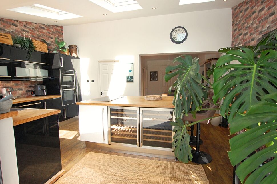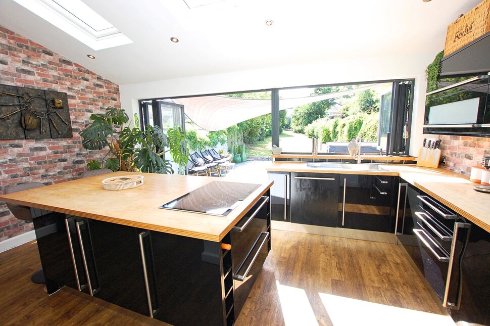 Double glazed bi-fold doors and a double glazed bi-fold window to the rear, ceiling with recessed spot lights and three double glazed Velux roof windows. Wood effect flooring, vertical radiator. The kitchen is fitted with a range of base and eye level wall units with contrasting Bamboo work surfaces. Central island unit with storage, two integrated wine chillers and an inset induction hob. Inset stainless steel sink unit, built in self cleaning oven and a built in self cleaning combination oven. Door to the utility room.
